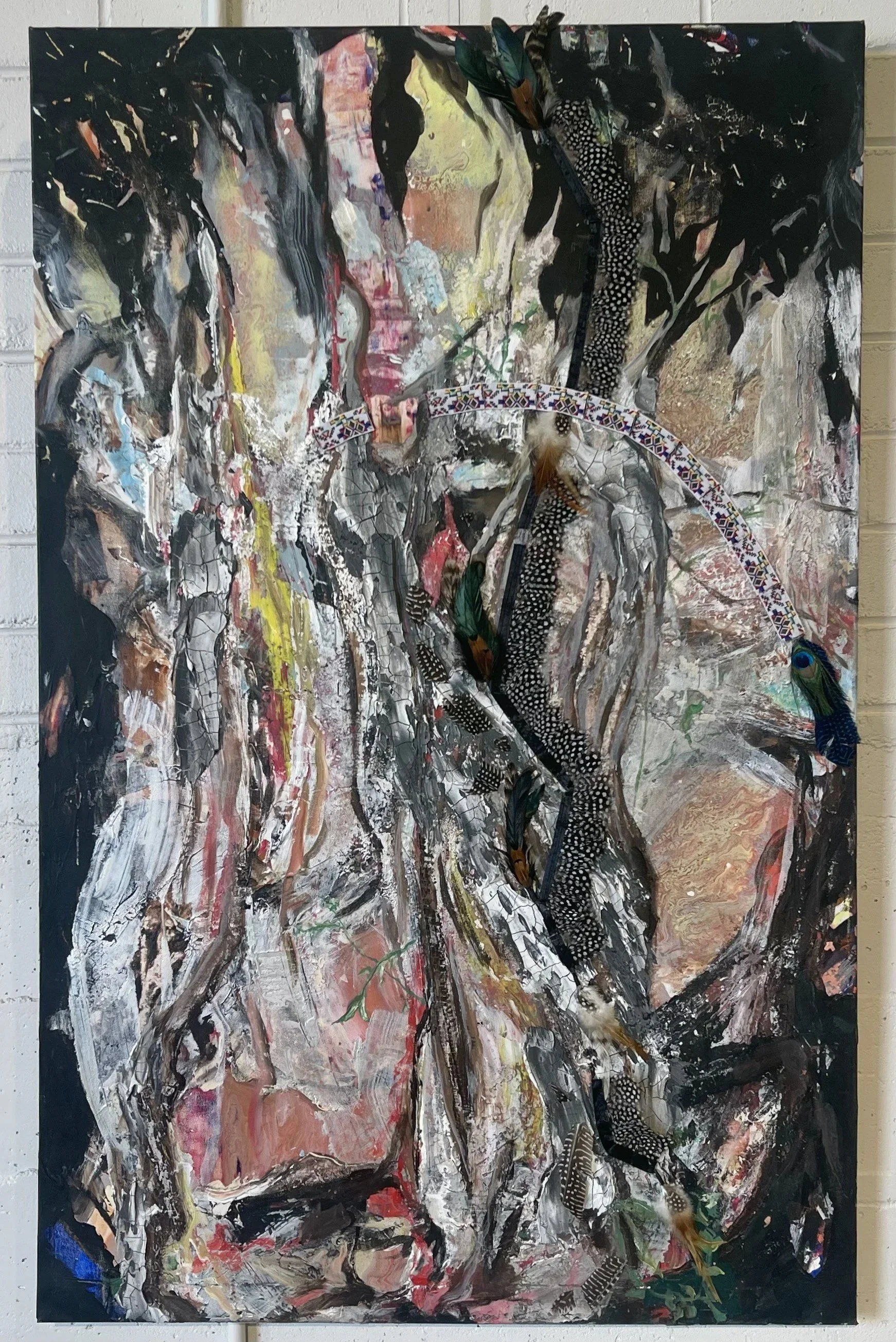 This series of paintings, mosaics, and installations have a common language rooted in indigenous symbolism; creating a narrative where a bridge becomes an essential tool connecting cultures and ideas —this body of work is a story of international and inter-temporal relationships; where an energy exchange that creates the foundation of a bridge becomes a colorful expression of the experience of intimacy and deep empathy. Roan created this exhibition as an invitation to participate in the ongoing act of creation, crossing metaphorical bridges where each heartbeat echoes the primordial energy of the cosmos and our human experiences. We can find bridges in the indigenous stories that are the foundation of modern culture, voices forgotten, and connections between borders rejected. In this exhibition, folkloric storytelling and philosophy meet—a testament to the enduring power of ancestral knowledge and the infinite ways in which we can interpret, celebrate, and co-create.
